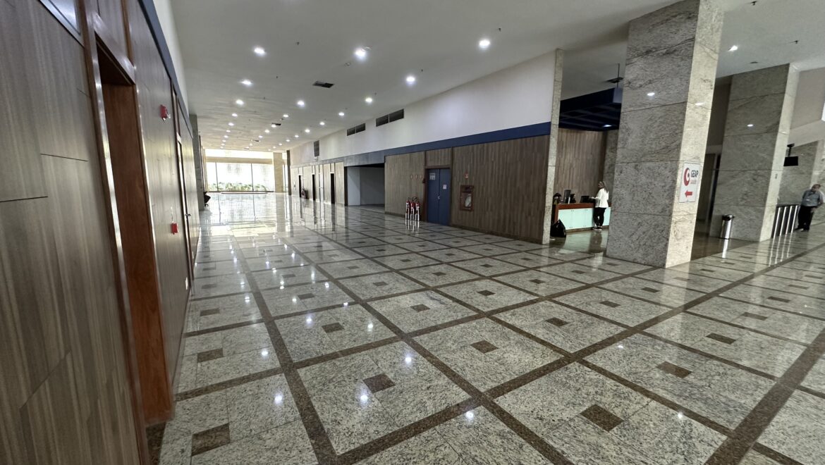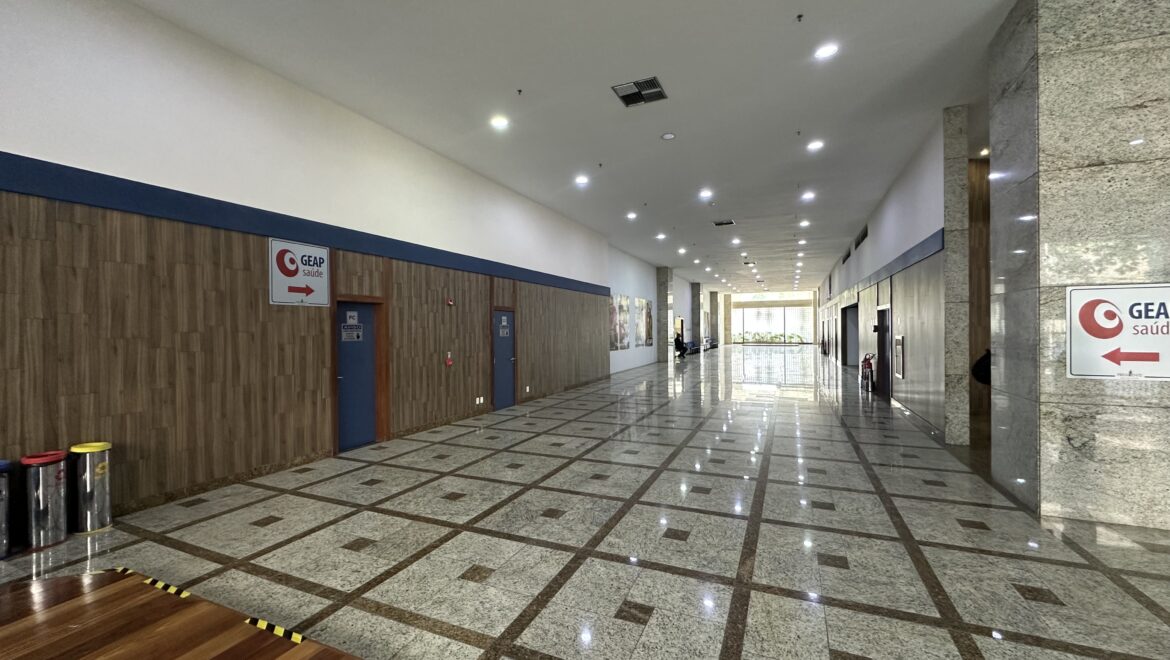🔹 Piso elevado, teto rebaixado, luminárias e ar-condicionado central