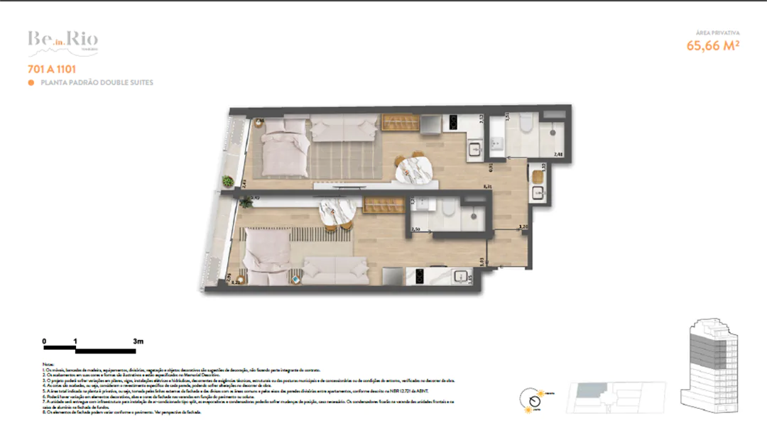 Os apartamentos Doubel Suites do Be In Rio Tonelero foram pensados para oferecer funcionalidade e conforto. Com metragens entre 65 m² e 72 m², as unidades são compactas, mas bem distribuídas, proporcionando um ambiente moderno e aconchegante. Essas opções são ideais para quem busca mais espaço e privacidade.